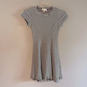 Super cute short sleeve striped black and white fit & flare dress from Monteau, in a size XS. Featuring higher crew neckline, short sleeves, and a fit & flare design all in a soft, stretch rib material; unlined; excellent condition ✨