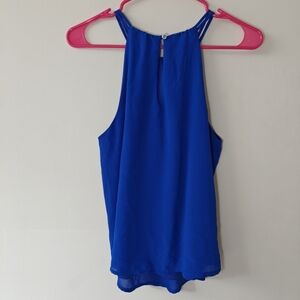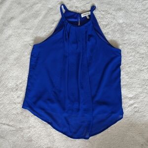 Monteau Sz Small Royal blue Sleeveless halter Top Blouse Pleated High Collar