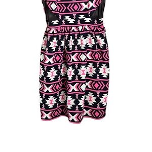Sleeveless tribal print dress with square neckline, elastic waist, hidden mesh panels at bodice sides, and deep scoop back. Bold pink, black, and white Aztec geometric print. Fully lined. Back zip. Lightweight. Modern boho fit.
