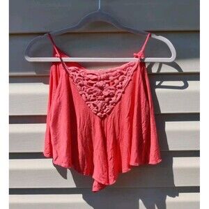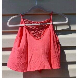 This is a Monteau women's cropped tank top in size medium. It features spaghetti straps and lace detail in front. It is in a coral pinkish/orangish color. The top is sleeveless with a pullover closure, making it a casual and stylish choice for summer and spring wear. The brand is Monteau, and it has a regular fit suitable for everyday use.