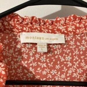 Monteau Womens Size L Floral Orange Pink Synced Waist Blouse Ruffle Sleeves