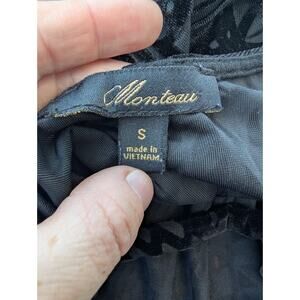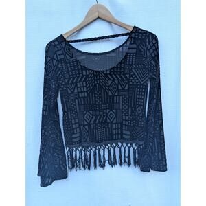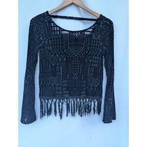 Monteau Womens bell sleeve velvet top S black geometric tassels boho Whimsigoth. Shirt is in very good condition with minimal signs of wear.
