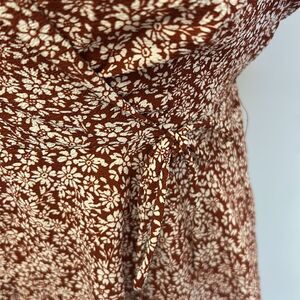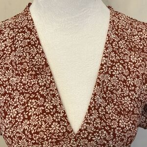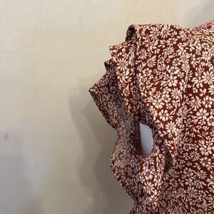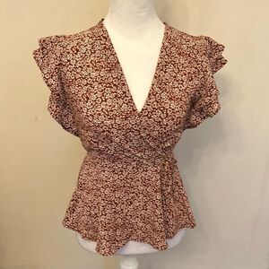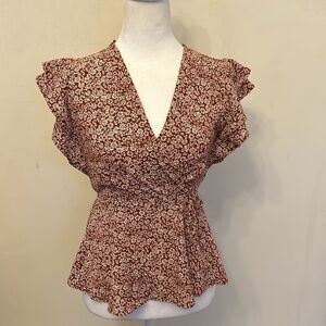 Monteau burgundy white floral cap sleeve tie front blouse Size S EUC
