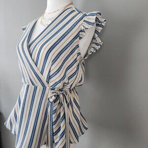 This adorable top from Anthro has a white background with blue stripes. There is a subtle pink stripe as well. Ruffle detail at open sleeves. Deep v-neck with faux wrap design and tie at waist. Loose ruffle at hem. Poly material has a beautiful texture but will keep you cool and wrinkle-free all summer long. This blouse is perfect for work, school, office, travel, weekends, errands, brunch etc and can be dressed up with a skirt or go more casual with some palazzo pants or cut off jean shorts. Either way, this is a summer staple for your wardrobe! In excellent like new condition, size Medium