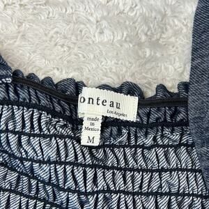Dark denim stretch bodycon dress with smocking in back and peplum ruffle. Bow detail on bust, no pockets.