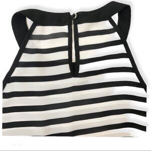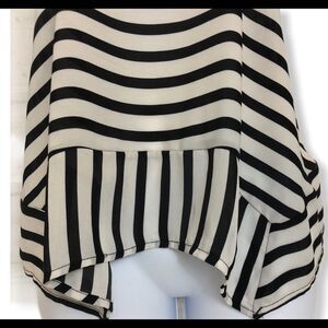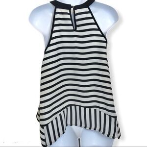 Monteau sheer drape style halter top with asymmetrical bottom. Keyhole back with button.
