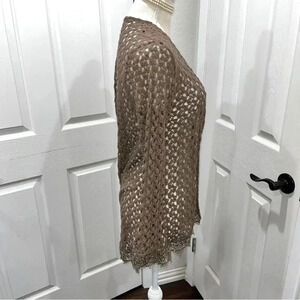 Beautiful open front duster kimono with an open knit stitch with beautiful lace trim on hem and sleeve cuffs. Pair with a tee, jeans and booties for the perfect look. Casually comfortable with a touch of style and class.