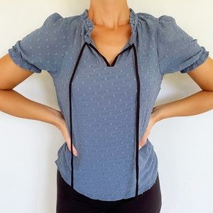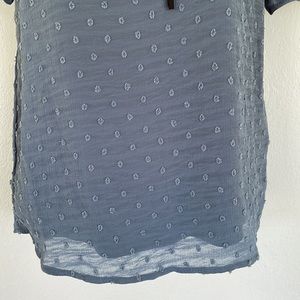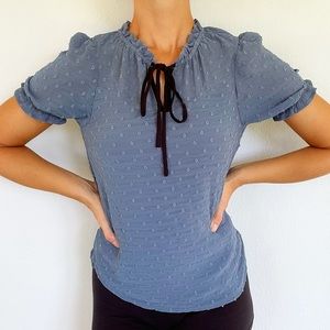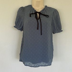 Monteau slate blue textured dot tie neck short sleeve blouse size small