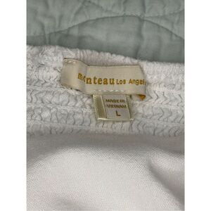 Monteau white linen blend strapless dress with fitted bodice and a-line skirt. Also has belt loops and pockets.