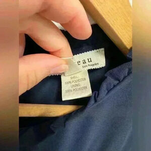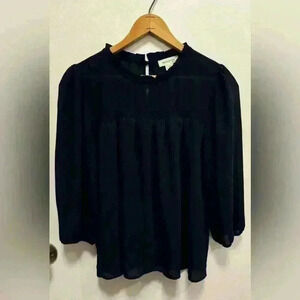 Monteau women’s navy blue long sleeve blouse with sheer top layer and lining within the core of the top in a size medium. Made of 100% polyester. Pullover top with keyhole closure in the back. Pre-owned and in very good condition.
