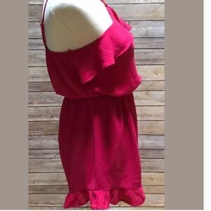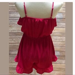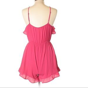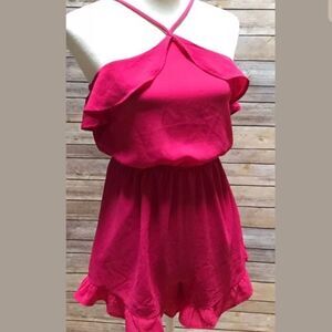 ✨ Brand new with tags Monteau Los Angeles Nordstrom women's romper hot pink halter style spaghetti adjustable straps ruffles lined shorts underneath size medium. Material: Polyester & Spandex (Polyester liner) Measurements flat: chest 17" & approximately 31" length but varies due to adjustable straps.