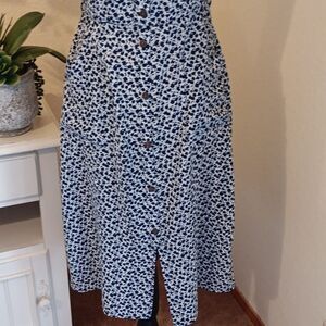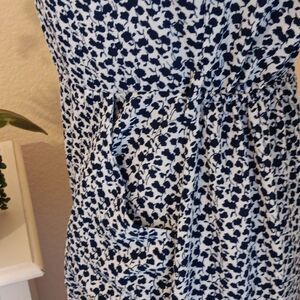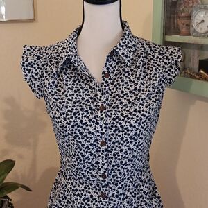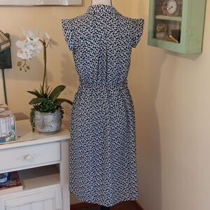 Chic Monteau dress with a black and cream leafy floral design. Crinkly fabric. Button front. Ruffly shoulders. Size M measures 38 at chest, 26-30 at waist, belt loops, sorry no belt. 40 at hips. Pockets here. 40 long from shoulder to hem. Elegant and versatile.