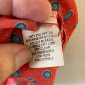Monteau sheer polyester button down collared shirt. Sleeveless. Red with blue and mint green polka dots. Women’s size medium. Preowned.