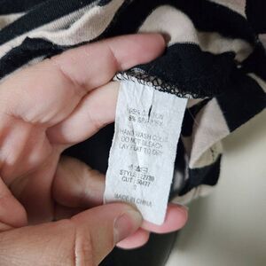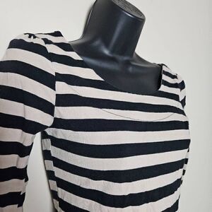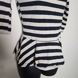 This is a striped peplum style blouse by Monteau. It has sleeves and light shoulder pads. On the back is a zipper.