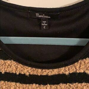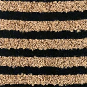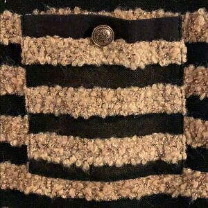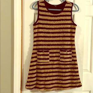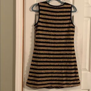 Black dress with ‘fuzzy’ tan stripes sewn in. Comfortable scoop neck with liner fabric sewn in from all top seems. 2 front pockets with antiqued gold buttons.