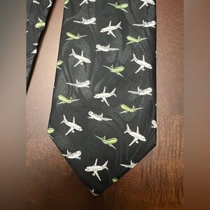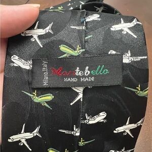 Fun and bold Montebello men’s necktie featuring a playful all-over airplane print in white and green on a black background. This handmade tie is a perfect gift for pilots, aviation enthusiasts, or anyone who loves a statement accessory.