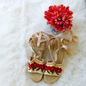 Canvas sandals embroidered with orange flowers and they tie around your ankle.