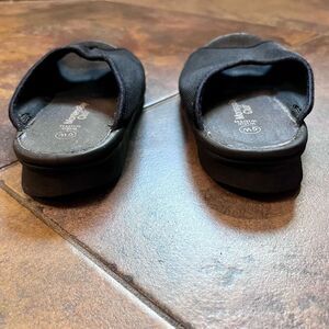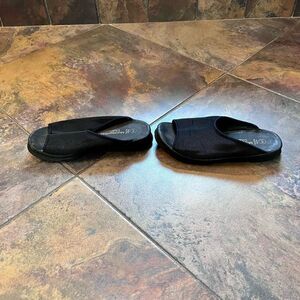 Montego Bay Club Women’s Stretch Slip-on Black Sandals Size 6 Wide. There is some wear on these shoes. Please review photos. Measurements in photos. In good, pre-loved condition. Comes from a smoke free home.