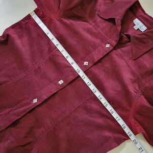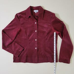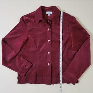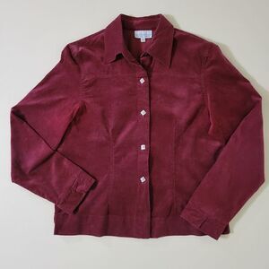 Stay on trend with this corduroy button-down from Monterey Bay. It comes in a rich burgundy color and features long sleeves, a collar neckline, and pretty square metal buttons. Pair over a graphic tee with jeans, and you're set for the perfect outfit of the day! Excellent condition.