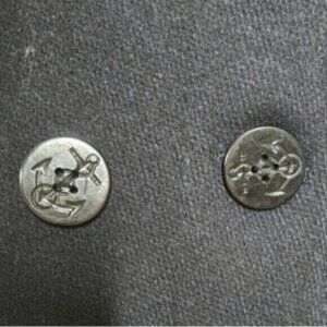 This is a vintage navy peacoat from the 1940s World War II era, crafted in the United States. Its design reflects the rugged functionality and timeless style associated with military outerwear during the war period. The coat is constructed from a thick, heavy wool material, providing excellent warmth and protection against the elements, typical of military-grade outerwear from the 1940s. he wide notched lapel collar adds to the classic peacoat structure, allowing it to be worn up or down depending on the weather or style preference. Two front vertical pockets are subtly integrated, providing both storage and warmth for the hands, while maintaining the coat’s clean, structured look.