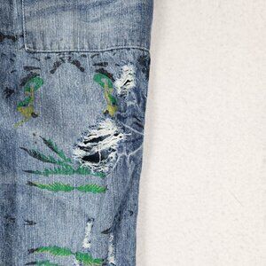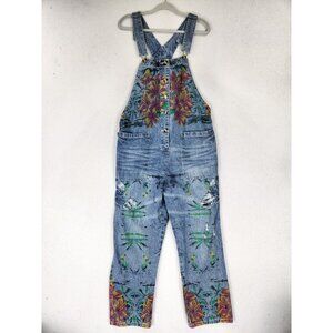 Monthorigin Overalls Womens Large Blue Floral Print Bibs Denim Distressed Casual. In very good pre-owned condition. No flaws noted.