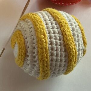 MontiKids Misc. Balls. There is a large Soft Ball 7” across, a kicking Ball, and a Crochet Ball.