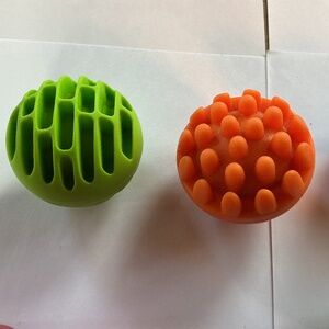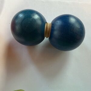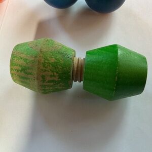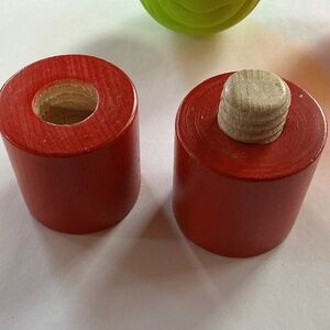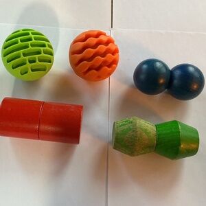 MontiKids? Misc Toys. Includes three wooden shapes that screw together and two silicone balls. When shaken, the balls ring inside bells. I think that all the pieces are MontiKids pieces but they’re not marked. After I posted this, I found one more yellow piece which I’ve added.