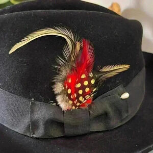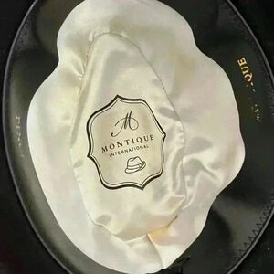 Montique International Fedora with Feather details and black trim with hat pin. Circumference 22” Please see photos for details and conditions. Open to offers. Fast shipper.