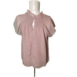 Moodie Blush Pink Boho Smocked Blouse Metallic Flutter Sleeve Peasant Top sz M