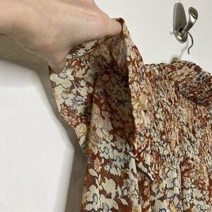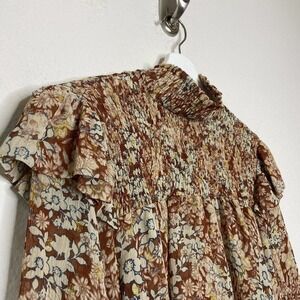 Moodie Metallic Gold and Rust Floral Smocked Ruffle Sleeve Swing Blouse S