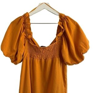 This dress is so darling! A beautiful golden color and fun puff sleeves. Slightly off the shoulders with a smocked back. 60% cotton, 30% linen, 10% polyester. Size Medium. In excellent pre-owned condition; no visible flaws.