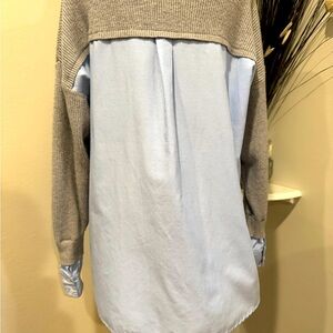Crafted from a luxurious blend of 55% viscose and 45% nylon, this sweater in a stylish heather gray features a flattering V-neckline and unique layered detailing. The back showcases a chic contrast with a light blue fabric, adding an eye-catching twist. Measurements: 26 inches from shoulder to hem, 26-inch sleeves, and 20 inches pit to pit.