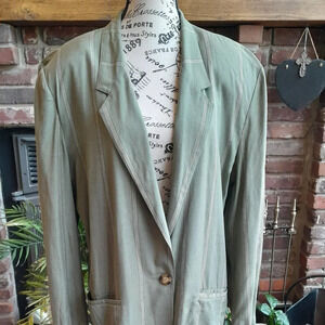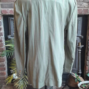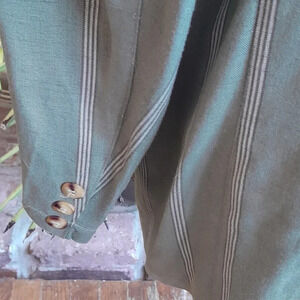Moods by Krizia Blazer and Short Set Gently Loved Vintage 1980's Med Green with ivory stripes Blazer Large. Shorts Size 10. Shorts Bermuda with cuffs 67% Rayon 13% Linen