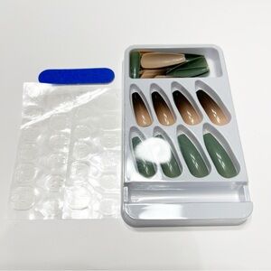 Get that luxe, moody vibe with this stunning set of press-on nails featuring a captivating blend of sage green solids and a dramatic black-to-nude ombré design. Perfect for creating an effortlessly chic look for any season. The set includes 24 reusable nails in various sizes, adhesive tabs, and a mini nail file for easy application. Elevate your manicure game with this edgy yet elegant set.