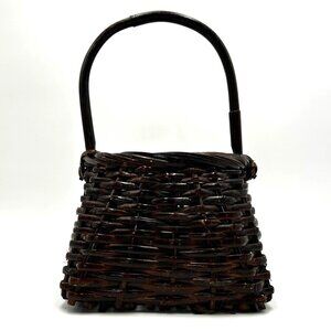 Moody VTG Woven Wicker Dark Brown Rattan Basket Sturdy Bamboo Handle Primitive