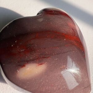 An Australian mookaite jasper heart carving showcases vibrant earthy tones of red, yellow, and brown, symbolizing strength and vitality. Known for its metaphysical properties, Mookaite jasper enhances decision-making, promotes emotional growth, and provides a sense of stability, grounding, and confidence.