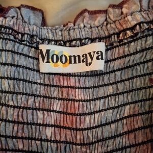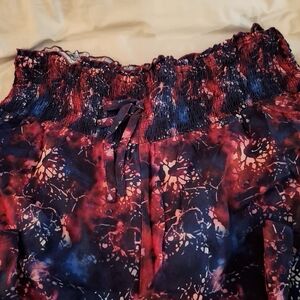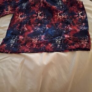 Moomaya women's Stylish wide leg pants featuring a vibrant floral design in red and blue. Perfect for adding a pop of color to your wardrobe. Can be used for beach cover-up or lounging in comfort. Has elastic waist and front tie. Size Large. waist side to side measures 16 inches with stretch. Length 42 inches. Flare at bottom measures 15 inches across.