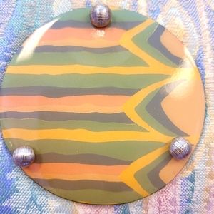 EUC Mint Condition 80's One of a Kind Pastel fabric pattern clam shell style bag with white leather trim and strap. Bag features signature acrylic adornment