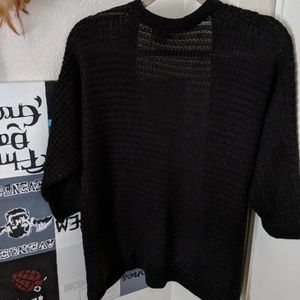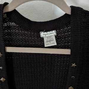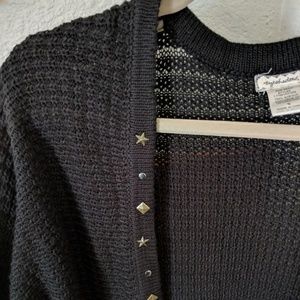 Adorable black cardigan with circle, diamond, and star shapes on the front. The knit black fabric is super soft and perfect for this fall. It drapes nicely over a dress or leggings!