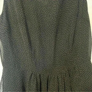 Charming sleeveless dress by Moon Collection featuring delicate pink polka dots on black background. Classic fit and flare silhouette with fitted bodice and full skirt. Delicate sheer overlay.