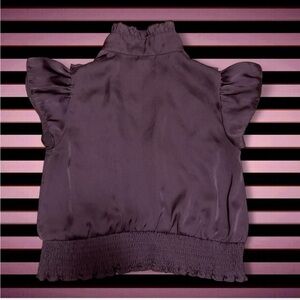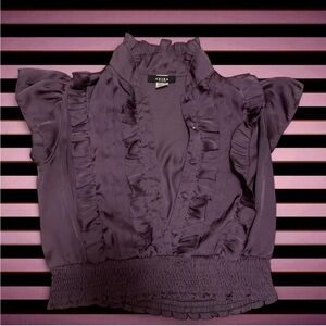 Deep purple blouse with layered ruffle trim. Pintuck detailing along the front. Smocked waist for a fitted silhouette. Short flutter sleeves and button-front closure.