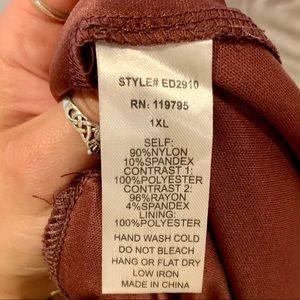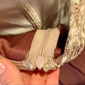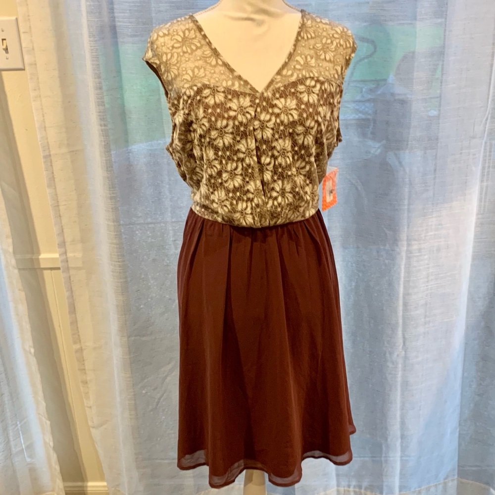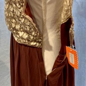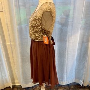Unique Moon Collection lace dress NWT, never worn. Beige and cream lace v-neckline bodice with burgundy chiffon skirt. Top is partially lined in the front, with open key-hole back. Skirt is fully lined with a tulle like overlay; soft and flowy. Side zipper with hook and eye closure. Two belt-loops with removable ribbon belt—can be tied in front or in back.