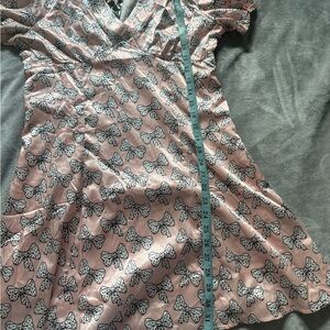 Stylish pink top with bow pattern. Features a V-neck and gathered shoulders.