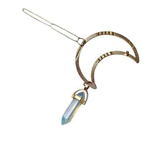 Boho hair accessory, celestial hair clip, moon hair pin, gemstone hair barrette, festival hair accessory, crescent moon clip, bohemian hair jewelry, spiritual hair pin, gold tone hair accessory, cosmic style hair clip, metaphysical gemstone clip, crystal hair jewelry, mystical moon hair accessory, women’s boho festival accessory, celestial wedding hair pin