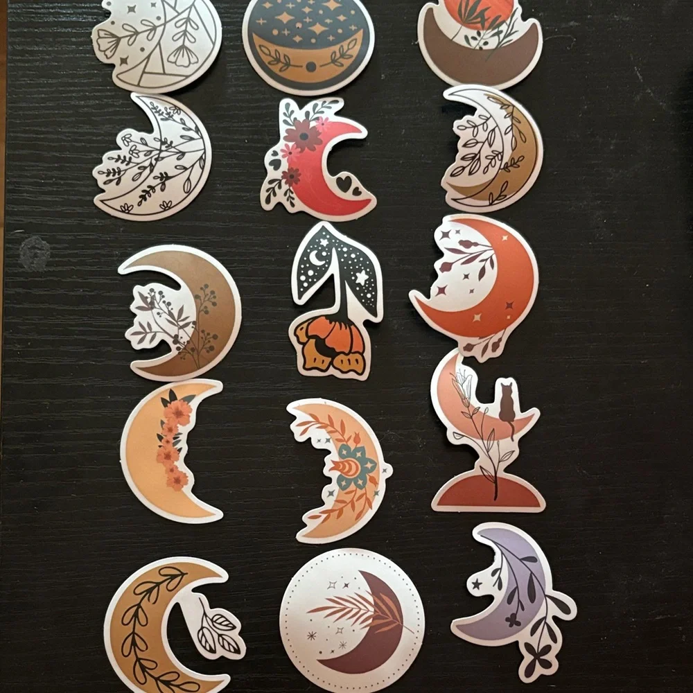 Set of moon phase stickers in various colors including orange, brown, and black. Perfect for decorating journals or laptops.