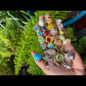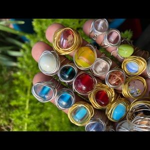 I make these rings in any color of wire! Some beads are one color but most of them are multicolored. They’re about 5/8 in. wide. The pinky rings are smaller, about half an inch.