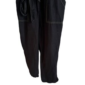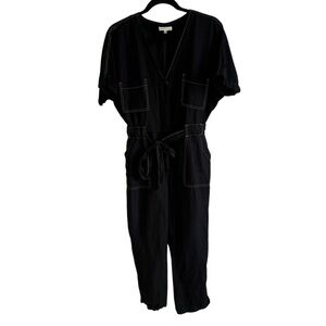 Super cute belted utilty-style jumpsuit from Moon River. Black with white stitching. Size Medium, cropped length. In great preowned condition; no visible flaws. This is a super comfy piece!