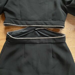 Chic black mini dress. Features puff sleeves and cut-out details. Stylish and modern.