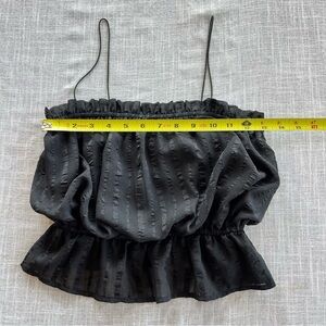 Chic and feminine black ruffle top by Moon River. Features delicate spaghetti straps, textured chiffon fabric, and a smocked waist with peplum hem. Perfect for pairing with jeans, skirts, or layering under blazers.