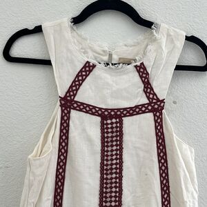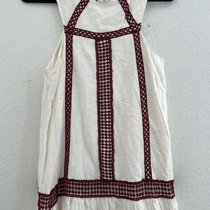 This very cute BoHo dress is white/off-white with burgundy details. Color is rounded with fringe detailing. Dress is fully lined and has one button on the back of neck. Knee length. Extra button included. Dress does have a very slight black spot on front as shown in photos. It looks like it’s woven into the fabric and not a stain.